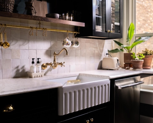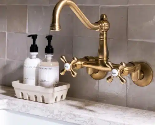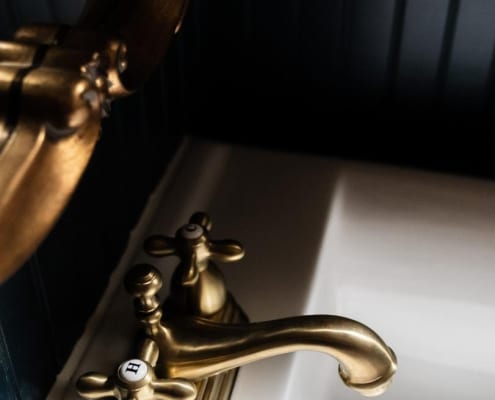 The vintage-style faucet in both the bathroom and the kitchen establishes a connection between the rooms.