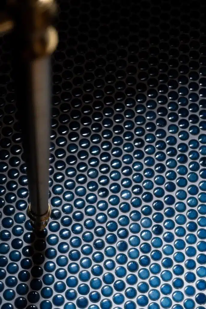 This tile has stunning depth to it. The deep blue tone flows well with the other tones in the powder room.