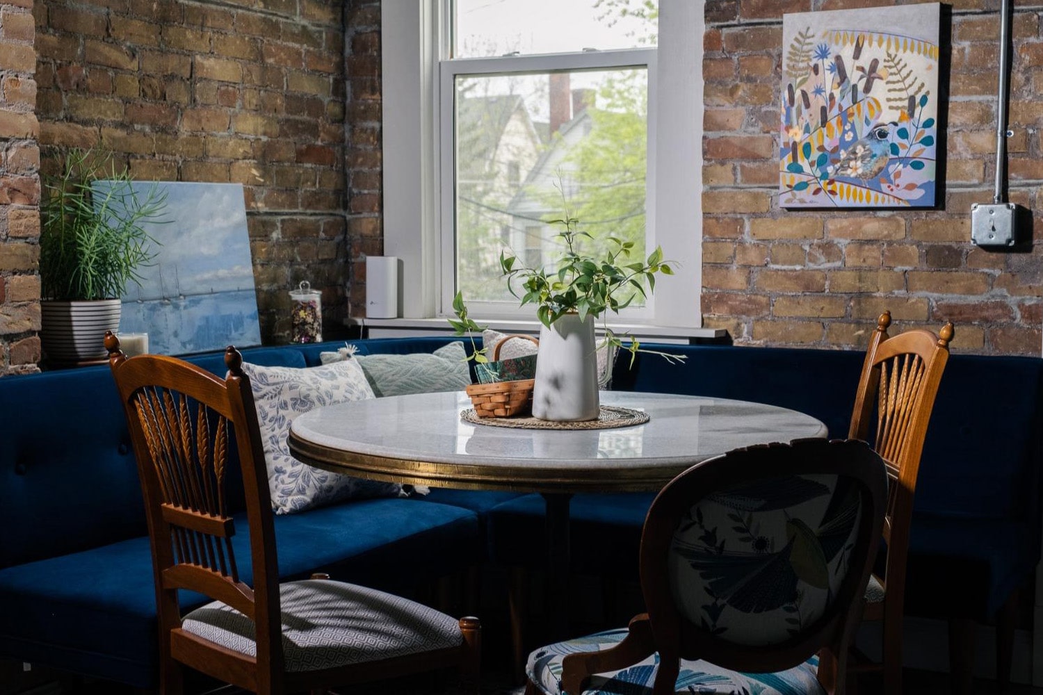 With the kitchen and powder room getting an update, they also decided to help the dining room. Exposing the old brick of the original building helps tie it to the older feel, along with some carefully curated furnishings.